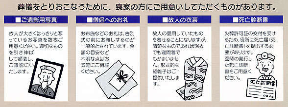 葬儀を行うにあたり、喪家の方にご用意いただくものがあります。